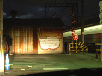 こちらはスローアップと呼ばれる物です。スローアップはタギングよりも少し時間をかけ文字に厚みや陰を入れます。グラフィティでは時間をかければかけるだけリスクが高まります。これが描かれているのは線路沿いですが、これをグラフィティではトラック沿いと呼び電車に乗っている人をターゲットに描かれています。これは大阪・なんば駅と和歌山駅をむすんでいる私鉄南海本線沿いの物です、南海本線沿いにもかなり多くのグラフィティが描かれていますので、乗られる方はチェックしてみて下さい。 | ||||||||||||||||